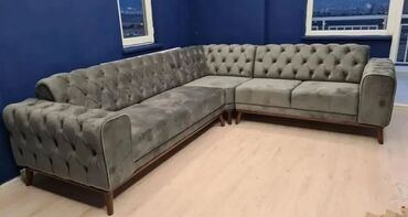 - Künc L-formalı iri divanlar: geniş oturma sahəsi, yüksək arxalıq, dekorativ düyməli kapitone.