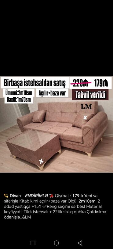 Divan – şəhər daxili pulsuz çatdırılma - Ölçülər: 210 sm və 260 sm variantları qeyd olunub - Mexanizm: açılan, bazalı (yataq funksiyalı, içi geniş saxlama yeri) - Karkas: möhkəm konstruksiya - Döş...