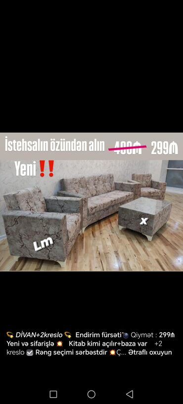 DİVAN + 2 KRESLO dəsti - Endirim fürsəti - Qiymət: 299₼ - Yeni və sifarişlə - Divan “kitab” kimi açılır, baza var - 2 ədəd kreslo daxil - Rəng seçimi sərbəstdir Mərmər naxışlı parça üzlük, rahat ...