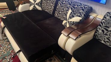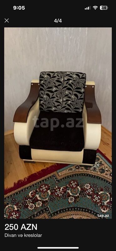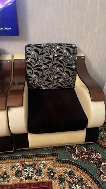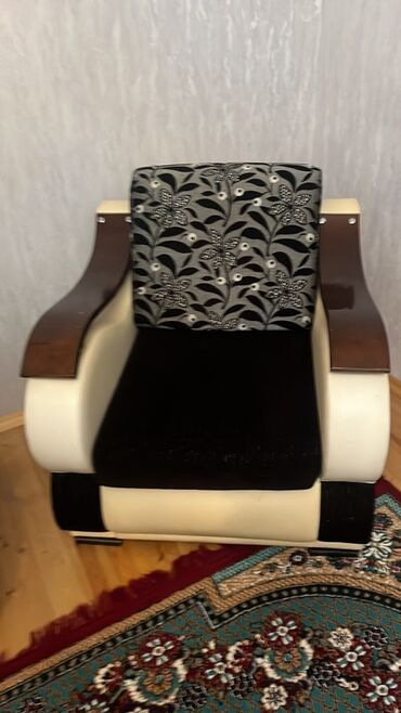 - Rəng və dizayn: qara oturacaq, krem bazalı korpus, tünd qəhvəyi taxta qol dayaqları; arxa hissə boz-qaranın çiçək naxışlı parçası ilə