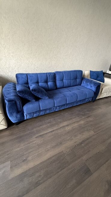 Mebel dəsti – künc divan, kreslo, düz divan və puflar - Künc divan: Dərin mavi tonlarda L‑şəkilli dizayn. Oturacaq və kürək hissəsində yumşaq, toxumalı parça, dekorativ qızılı zolaqlı yastıqlar. Y...