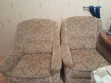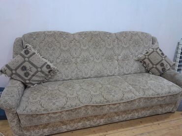 Mebel dəsti PULSUZ - Divan: Krem rəngli, yumşaq parçalı, klassik qabarıq bel hissəli model. Ön hissədə dekorativ qara detallar. Alt hissədə çəkicilər üçün nəzərdə tutulmuş tutacaqlar görünür. Geni...