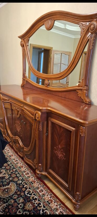 Zərif klassik üslubda mebel dəsti - Vitrin şkaf: Önü şüşəli, üç rəfli konstruksiya. İç hissəsi işıqlı görünüşə uyğun şüşə rəflərlə (qab-qacaq, dekor və kolleksiya əşyaları üçün ideal). Korpus krem...