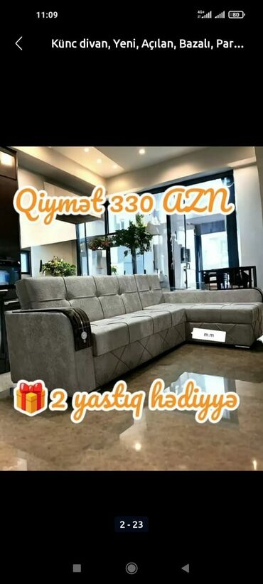 Künc divan dəstləri – yeni sifarişlə - Model: L-şəkilli künc divanlar - Funksiyalar: bazalı; “kitab” kimi açılır - Komplekt: bəzi modellərdə 2 ədəd hədiyyə yastıq, digərində 6 ədəd yastıq göstəril...