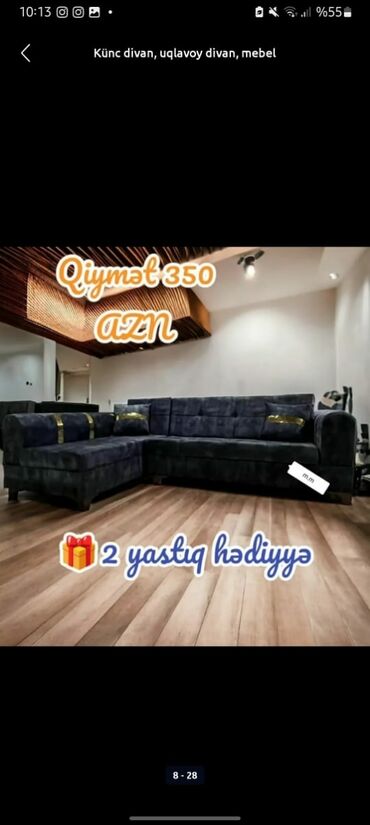 Künc divanlar – yeni sifarişlə hazırlanır. Mövcud modellər: - Sadə və rahat künc divanı, iki ədəd paduşka ilə. Qiymət: 310 AZN (şəkildə göstərilib). - Qara-qızılı detallı, metal qızılı ayaqlı dəbl...