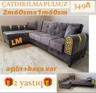 Məhsul: L‑şəkilli künc divan • Mexanizm: Açılan bazalı • Ölçü: 260 sm x 160 sm • Rəng seçimi: Mümkündür • Yastıqlar: 2 ədəd hədiyyə • Çatdırılma: Bakı şəhəri daxilində ödənişsiz • Çatdır...