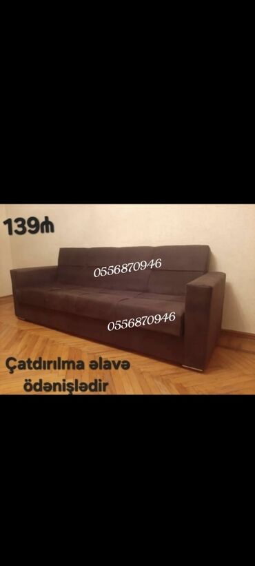 - 3 nəfərlik divan (tünd qəhvəyi): sadə, düz xətli dizayn, geniş oturacaq və qol hissələri. Qiymət: 139 AZN (şəkildə göstərilib). Çatdırılma əlavə ödənişlidir (şəkildə qeyd edilib).