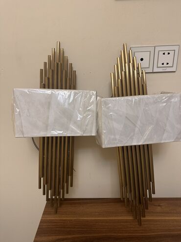 - Müasir-lüks dizaynlı divar bra – hər biri qızılı rəngli metal borulardan ibarət dekorativ əsas və düzbucaqlı ağ abajurla.