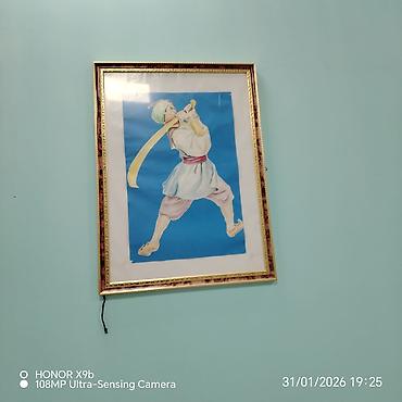 - Çərçivəli illüstrasiya: Mədəni motivli, milli geyimli oğlan obrazı. Açıq mavi fon üzərində işlənib, qızılı rəngli klassik çərçivədə. Divara asmağa hazırdır.