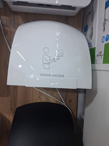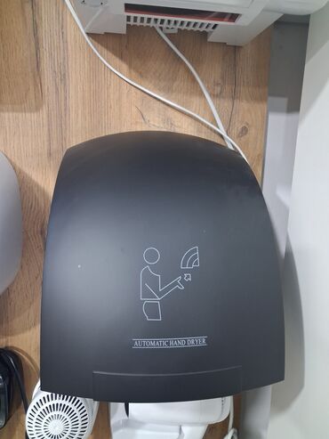 - Avtomatik əl qurutma aparatı: infraqırmızı sensorla işə düşür, iri korpus, ön paneldə piktogram və “Automatic Hand Dryer” işarəsi. Üst havalandırma ızgaraları və aşağıdan hava çıxışı. Divara montaj üçün nəzərdə tutulub, 220V şəbəkə ilə işləyir.