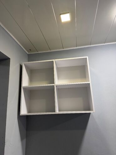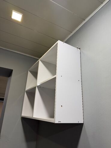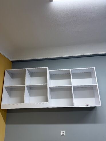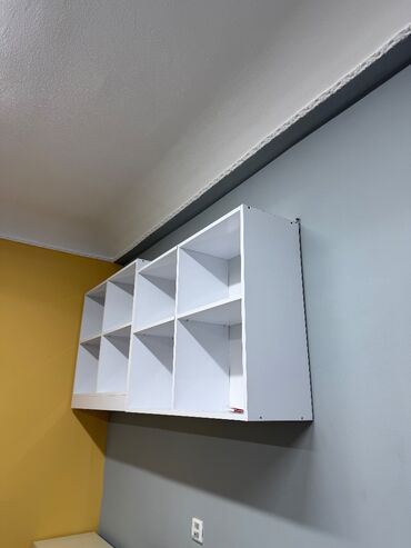 Ağ rəngli çoxbölməli divar rəfi - Material: laminat/MDF tipli ağ örtüklü taxta - Dizayn: açıq tip, müxtəlif ölçülü çoxsaylı bölmələr; yuxarı hissədə iri otaqlar, orta hissədə kitab və sənədlər üçü...