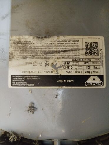 - Üzərində texniki etiket: Zilmet genişlənmə çəni, Type S21, 8 litr, 3 bar; Made in Italy.
