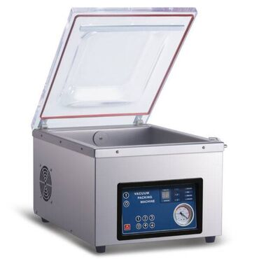 2) Kameralı vakuum paketləmə maşını – polimer paketlərdə havanı çıxarıb hermetik qaynaq edir. Masaüstü konstruksiya, şəffaf örtük, idarə paneli və manometr; qablaşdırma vaxtı, vakuum dərəcəsi və qaynaq müddətini tənzimləmə.
