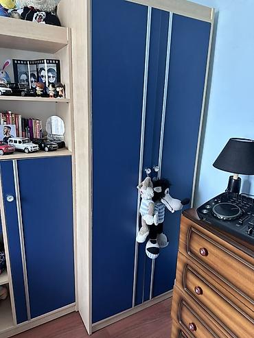 Uşaq/yeniyetmə otağı üçün mebel dəsti Tərkibi: - 3 qapılı dolab: ortada tam ölçülü güzgü, asılqan bölməsi və rəflər; metal tutacaqlar, mavi-ağ rəng. - Tək nəfərlik çarpayı: başlıq mavi-ağ, standar...