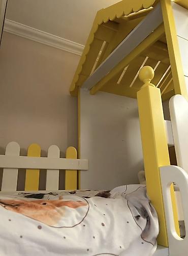 - Üst hissədə çardaq formalı oyuncaqlı evciyik: sarı-ağ rənglər, pəncərə açılışları, dekorativ dam və təhlükəsizlik məhəccərləri