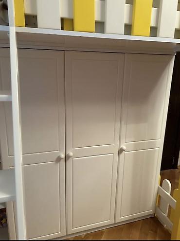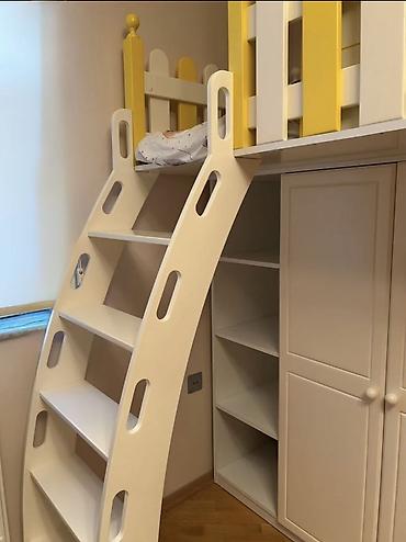 - Aşağı hissədə qapılı geniş qarderob şkafı və əlavə açıq rəflər – geyim, oyuncaqlar və aksesuarlar üçün