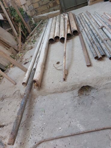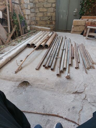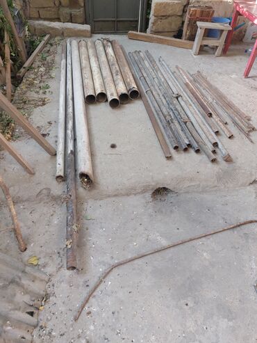 Metal borular – müxtəlif diametrlərdə - Material: polad/metal - Formalar: dairəvi kəsikli borular - Diametrlər: təqribən 3–10 sm aralığında (fotoşəkildə lent metr ilə ölçü nümunəsi göstərilib) - D...