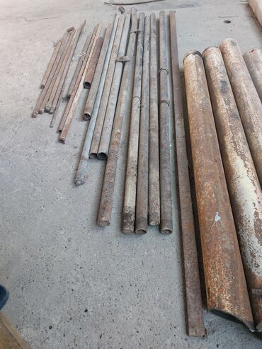 Məhsul: Metal borular dəsti Təsvir: - Fərqli uzunluqlarda bir neçə ədəd dairəvi kəsimli metal boru. - Xarici səthdə köhnə boya və pas qalıqları görünür. - Bəzi borularda bərkidici qulaqcıqlar/sopo...
