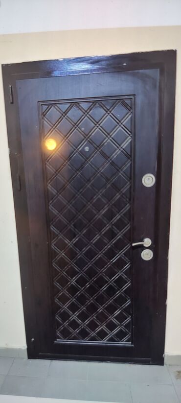 Dəmir giriş qapısı Yeni mənzildən çıxmış standart ölçüdə - Material: qalın metal (dəmir) konstruksiya, möhkəm qutu/kasa ilə - Rəng və dizayn: qəhvəyi rəng, panelli dekor və romb naxışlı bəzək ele...