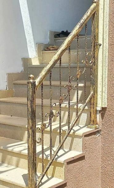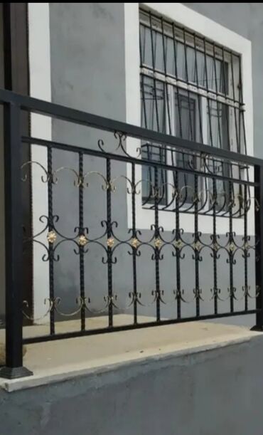 Şəkillərdə müxtəlif nümunələr: eyvan məhəccəri, pilləkən üçün maili rels, dekorativ qızılı fakturalı variant və pəncərə barmaqlığı. Dizayn və ölçülər sifarişə uyğun hazırlanır.