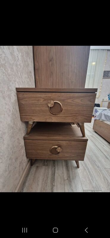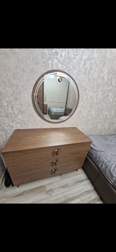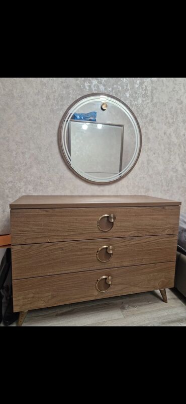 - Komod və asma dairəvi güzgü: 3 geniş çekmece, metal qızılı halqa formalı tutacaqlar, konik ayaqlar.
