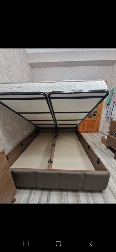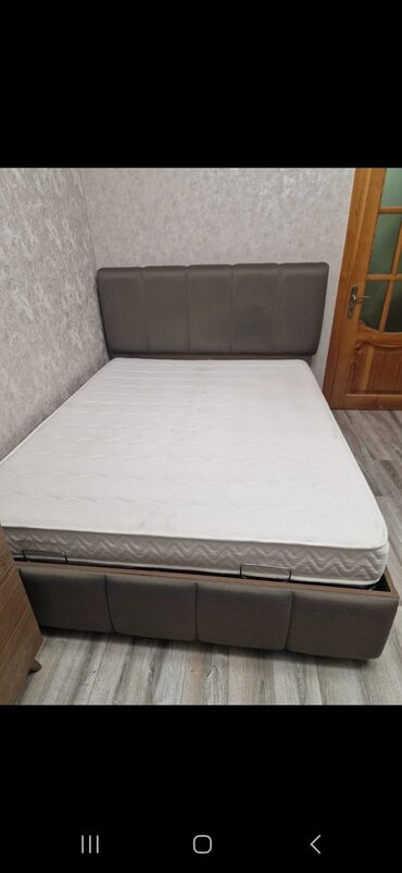 - Yumşaq başlıqlı çarpayı: geniş ölçülü matrasa uyğundur; alt hissədə qaldırma mexanizmi üçün metal tutacaqlar görünür (anbar bölməsi üçün uyğundur).