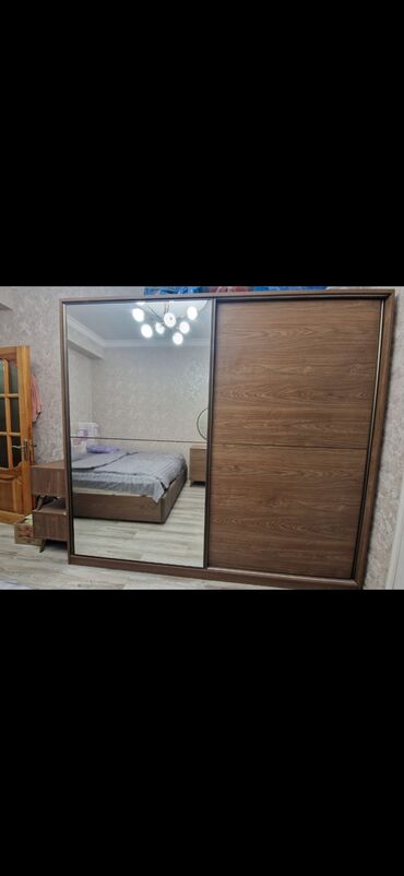 - Sürgülü qapılı, iri güzgülü şkaf: sağ tərəf taxta dekorlu panel, sol tərəf tam boy güzgü; yuxarıdan aşağıya alüminium rels sistemi.