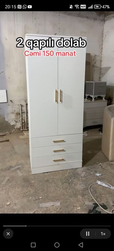 - 2 qapılı dolab – cəmi 150 manat. Üstdə iki qapı, altda 3 sürgülü çekmece. Sadə ağ dizayn, qızılı tutacaqlar.