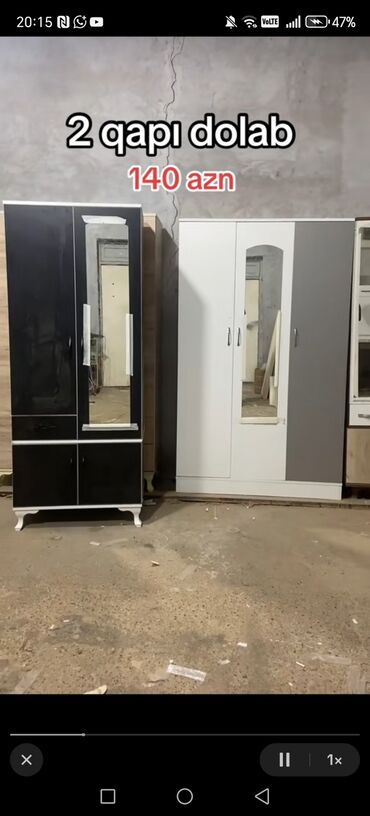 - 2 qapılı yeni dolab – cəmi 250 manat. İç quruluş: bir tərəfi asılqan, digər tərəfi çoxsəviyyəli rəflər; yuxarıda əlavə üst dolab.