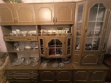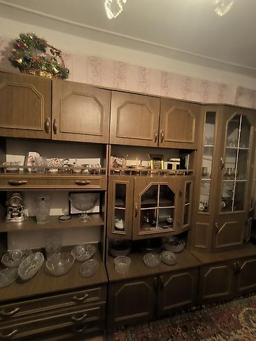 - Komplekt quruluşu: çoxmodullu divar sistemi – mərkəzdə şüşəli vitrin bölməsi, sağda hündür künc vitrin, solda açıq rəfli hissə; yuxarıda 4 iri qapaqlı şkaf, aşağıda isə geniş qapaqlı bölmələr və çekmecələr