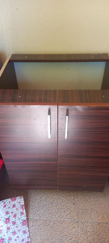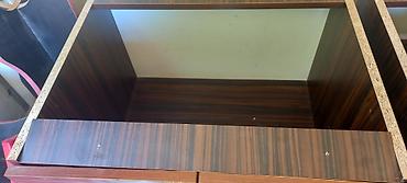 Ev üçün mebel - Material: yüksək sıxlıqlı MDF/LDSP lövhə, laminat örtük - Rəng/tekstura: tünd ağac naxışlı ön hissələr, açıq bej yan panellər; kənarlar tünd bordürlə haşiyələnib - Üstü və korpusu ...