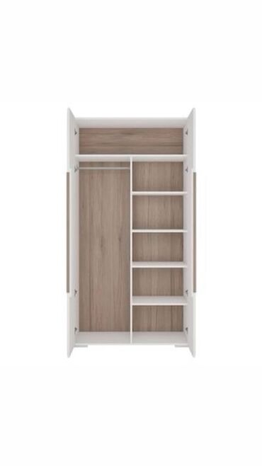 - Paltar dolabı: 3 qapılı daxili planlı model. Solda tamhündür asılqan borusu və yuxarıda uzun rəf; sağ bölmədə bir-birinin üstündə çoxsaylı rəflər, aşağıda əlavə iki bölmə. İç və arxa panellər ağ-açıq ağac tonlarının kombinasiyasıdır. Geniş saxlama imkanı, köynək/palto üçün asılqan zonası və qatlanan paltarlar üçün çoxlu rəfli quruluş.