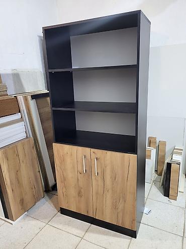 Mebel rəfi – açıq bölməli və qapalı dolablı - Material: ağac teksturalı laminat/LDSP - Rəng: açıq qoz (taxta naxışlı) - Konstruksiya: yuxarıdan aşağıya ardıcıl yerləşən 3 ədəd açıq rəf bölməsi + a...