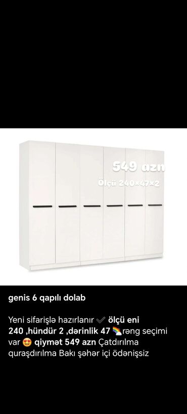 Diqqet eve aid olan her nov mebller movcuddur 1qapi 50x195x47 💥110azn 2 qapi 90x2x47💥 130azn 3qapi 120x2x47💥 165azn 4qapi 160 x2x47💥 230azn *🚫Kredit yoxdur* Satış olunan məhsullarımıza ətraflı ...