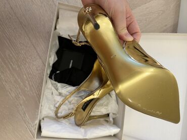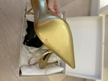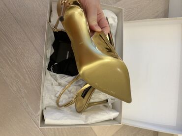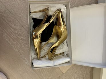 Qızılı rəngdə qadın tufliləri - Model: Klasik “pump” tipli, ucu sivri - Rəng və örtük: Parlaq metalik qızılı - Dikdaban: Təxminən 9–10 sm, nazik və parlaq qızılı tonlu daban - Material: Metalik ef...