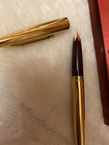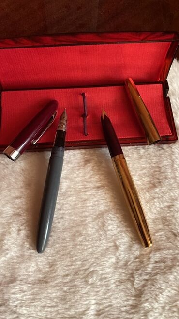 Mürəkkəblə dolma qələmlər.Qizili rəngdə olan Sovet qələmi olub,perosu qizil suyunda