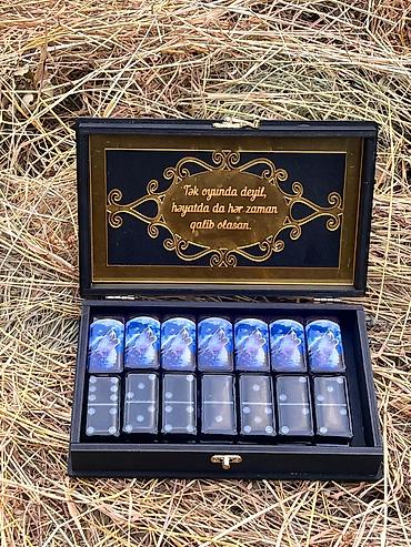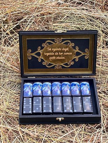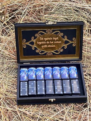 Zərif dizaynlı 0 dan epoksiden hazirlanmis el işi domino dəsti – taxta qutu və tematık fişlərlə.