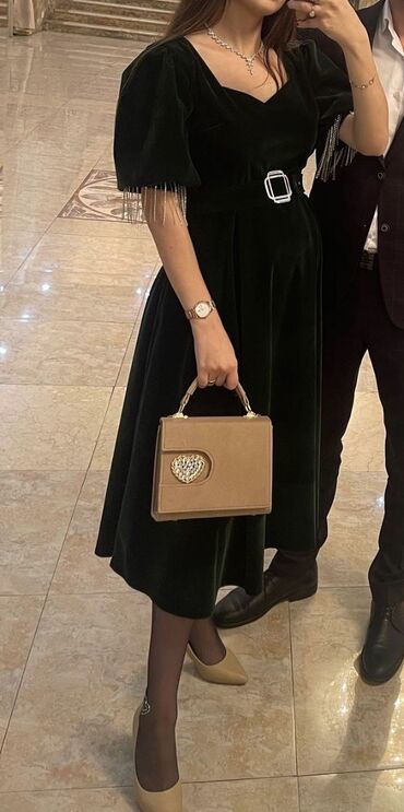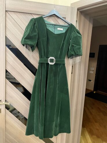 Нарядное темно-зеленое платье из плотной ткани, подойдет на размер S-m