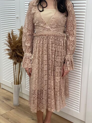 Zərif, parıltılı gecə donu. Lady Sharmdan alınıb. Ölçü 38. Cəmi 1 dəfə geyinilib. - Rəng: Şampan/bej, üzəri biser bəzəklərlə - Parça: şəffaf tor üstlü - Uzunluq: dizdən aşağı - Arxa hissə: gizli f...
