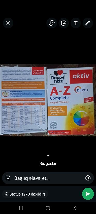 - Tərkibdən nümunə: A, D, E, K, C, B qrupları, kalsium, maqnezium, sink, dəmir və s. (dozalar qutuda göstərilib)