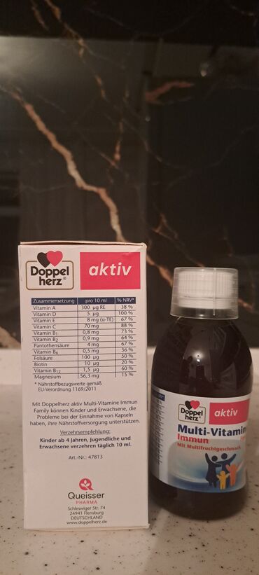 - Tərkib (10 ml üçün): Vitamin A, D, E, C, B1, B2, B6, B12, fol turşusu, biotin, pantoten turşusu, maqnezium və s. (faizlər qutuda göstərilib)