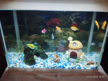 Akvarium satılır(uzunluğu45sm, eni25, hündürlüyü 30sm ) su qiızdırıcısı,hava filtri,süni ot bəzək daşları.2 aylıq yemi, akvariumun dibini təmizləyən.