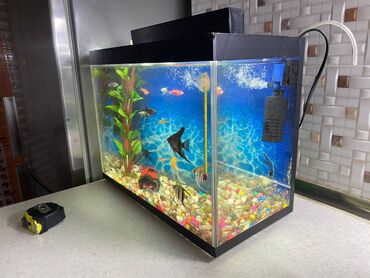 - Böyük ölçülü vitrin tipli akvaryum: geniş ön şüşə, dekorativ ağ çərçivə, üst işıqlandırma, arxa fon dekoru. Aşağıda taxta şkaf/stand (saxlama üçün əlverişli). - Orta ölçülü qövs formalı akvaryum...