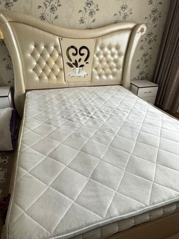 İki nəfərlik taxt və döşək - Ölçü: təxmini king/queen ölçülü (geniş ikinəfərlik) - Karkas: tünd qəhvəyi ağac fakturalı korpus, alt hissədə dekorativ qızılı haşiyə - Başlıq: geniş, ağ rəngli yumşaq...