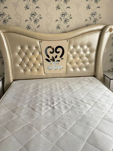 - Başlıq: krem rəngli, yumşaq dərimsi (eko-dəri) üzlü, kapitone (romb tikişli) dizayn. Ortada dekorativ güzgü/panel elementi və zərif bəzəklər. Yanlarda qızılı rəngli dekorlar.