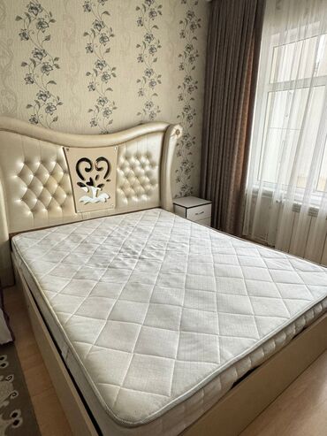 Yataq dəsti – başlıq, çarpayı korpusu və döşək - Başlıq: krem rəngli korpus, şaquli panelli qəhvəyi yumşaq dərili hissə, divara söykənən geniş dizayn - Çarpayı: ağ/krem tonlarında korpus, kənarlar...