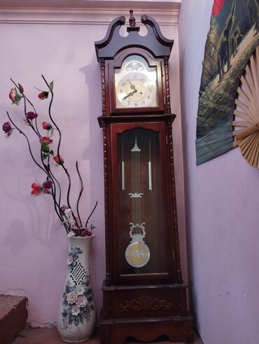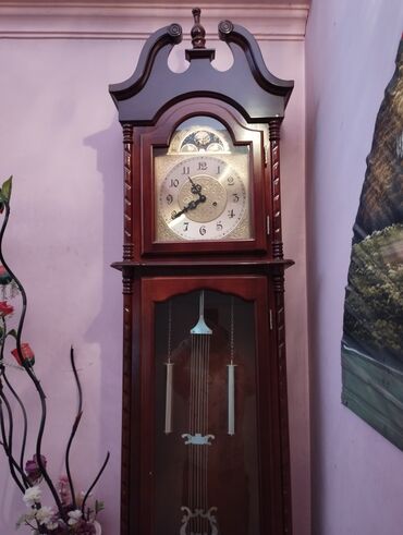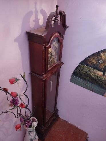 Məhsul: Mexaniki pendlikli döşəmə saatı - Korpus: Təbii ağacdan hazırlanmış, qırmızı-qəhvəyi cilalı şkaf; üst hissə yumru başlı; ön hissədə şüşə qapı (menteşəli) ilə mexanizmin görünüşü. - Siferbl...