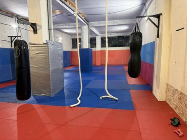 - Geniş, hündür tavanlı zal, döşəməsi tamamilə yastı tatami/rezin örtük ilə (qırmızı–mavi panellər).