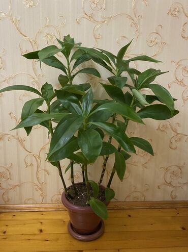 Otaq bitkisi – Drasena (Dracaena fragrans tipli), qəhvəyi plastik dibçək və ləkəqabı ilə.