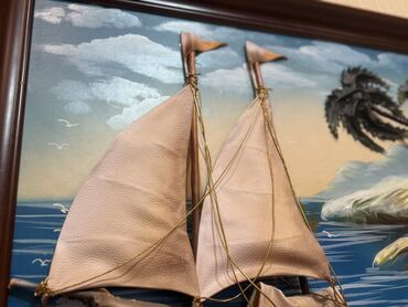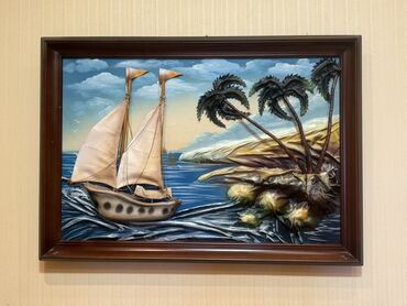 - Süjet: dəniz mənzərəsi – yelkənli gəmi, palma ağacları və qayalı sahil.